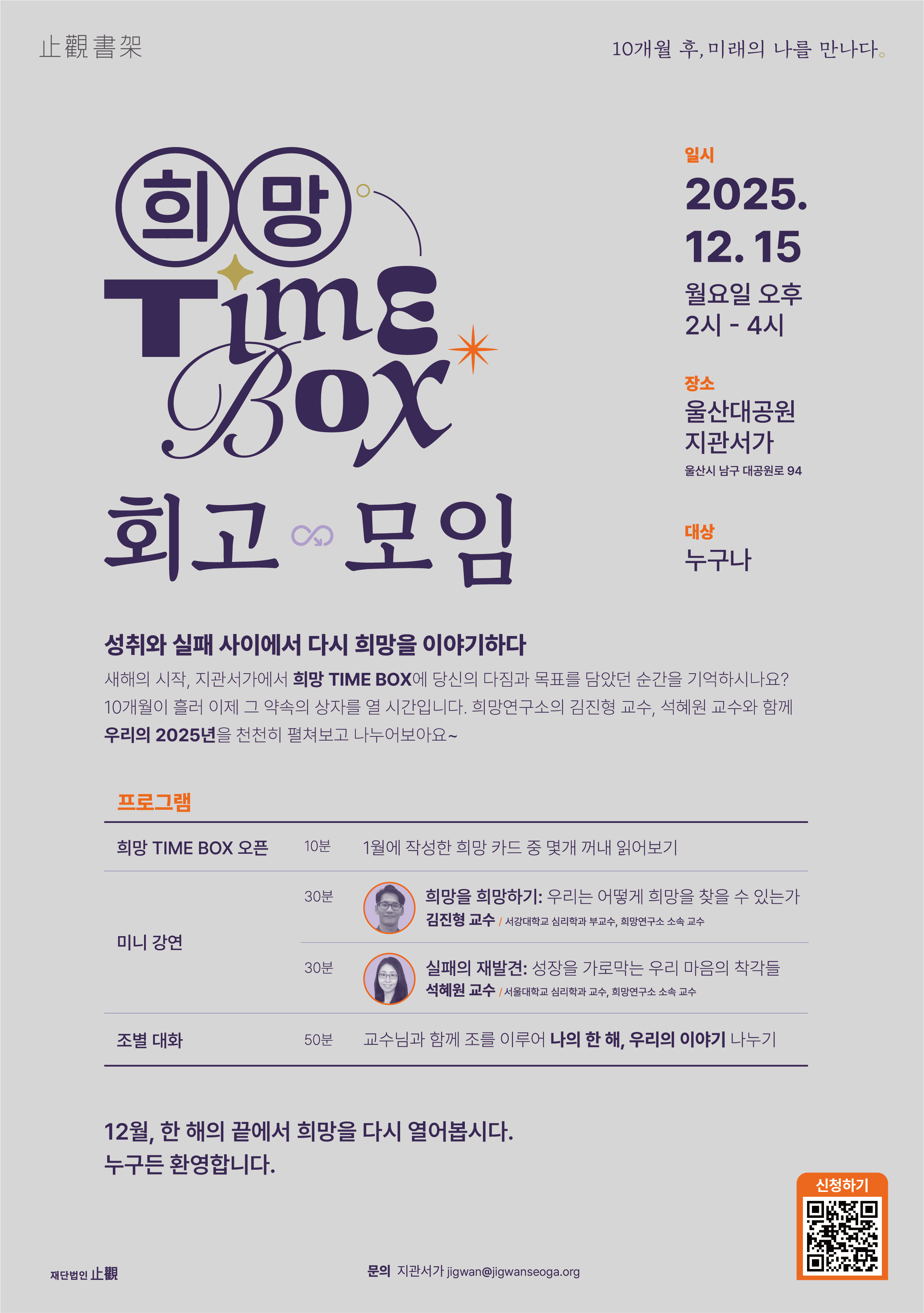 한 해의 끝에 서면 누구나 잠시 멈춰 서서 지난 시간을 돌아보게 됩니다. 지관서가에서도 지난 1월에 만들었던 ‘희망 TIME BOX’를 다시 열어보며, 우리가 지켜낸 것들과 미뤄둔 것들까지 차분히 바라보는 시간을 준비했습니다. 이루어진 다짐도, 중간에 멈춘 다짐도 모두 괜찮습니다. 중요한 건 다시 한번 희망을 꺼내 보는 일이니깐요.