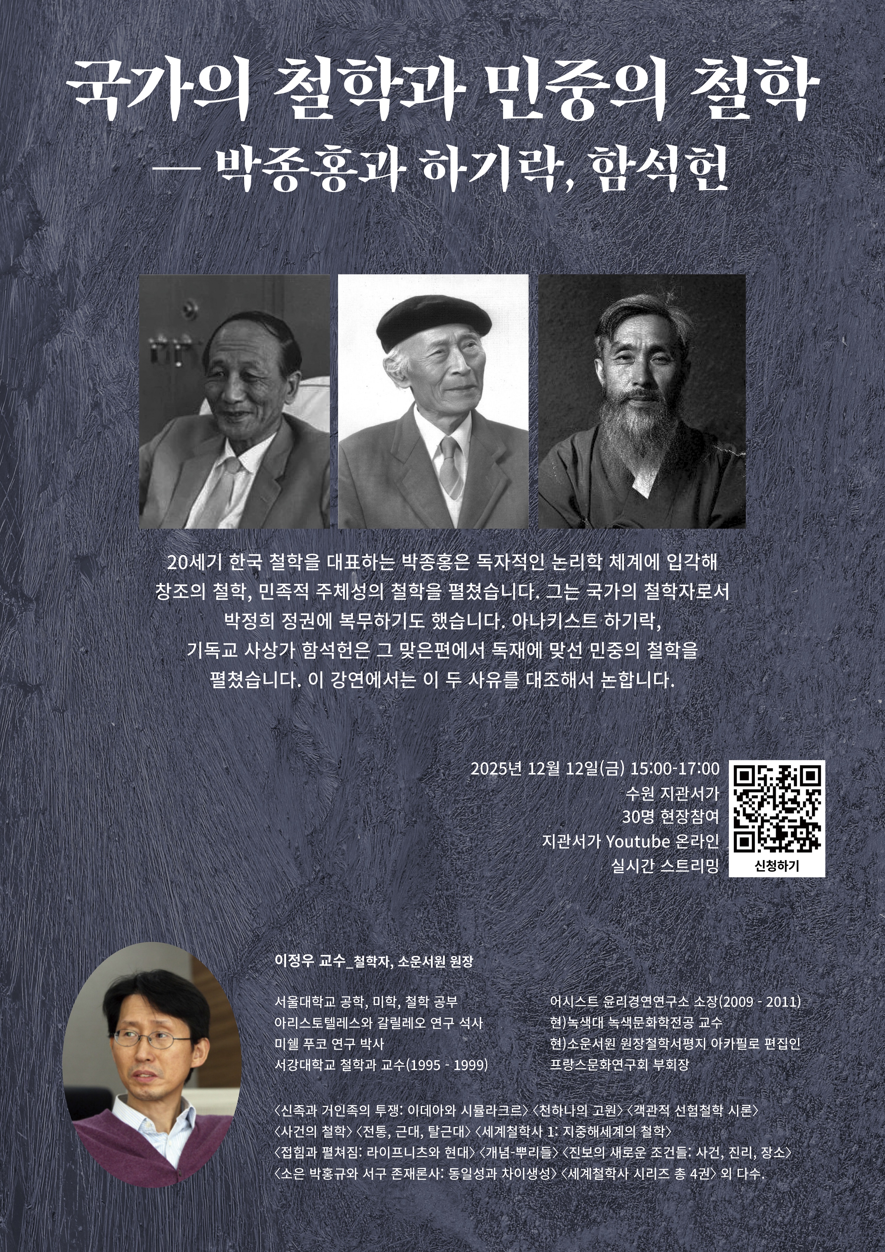 ■ 일시: 2025.12.12(금) 15:00~17:00 ■ 연사: 이정우 철학자(소운서원 원장) ■ 장소: 수원 지관서가 ■ 인원: 30명 현장 참여(무료) / 온라인 실시간 중계(YouTube 지관서가 채널) |