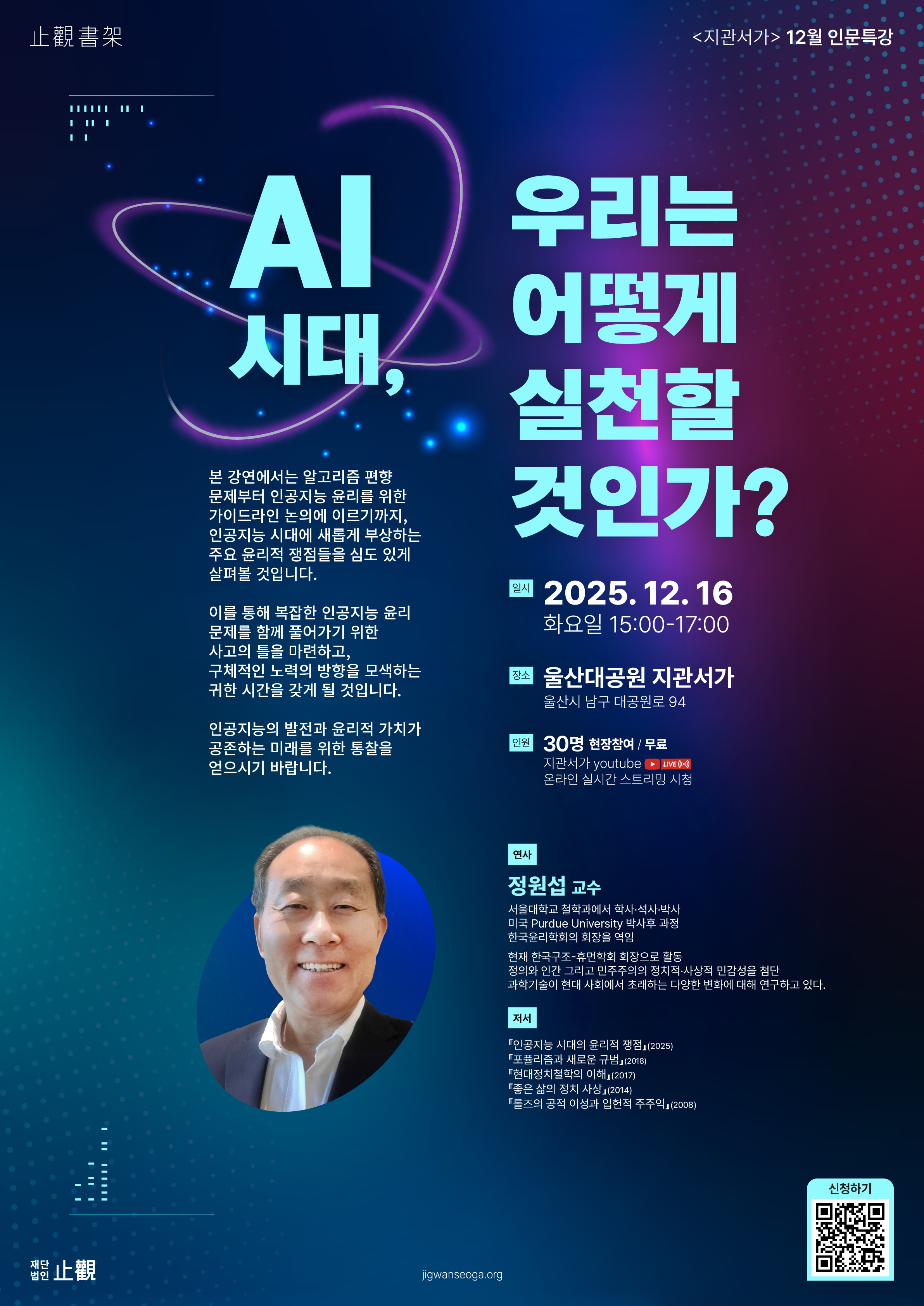 ■ 일시: 2025.12.16(화) 15:00~17:00 ■ 연사: 정원섭 교수 ■ 장소: 울산대공원 지관서가 ■ 인원: 30명 현장 참여(무료) / 온라인 실시간 중계(YouTube 지관서가 채널) |