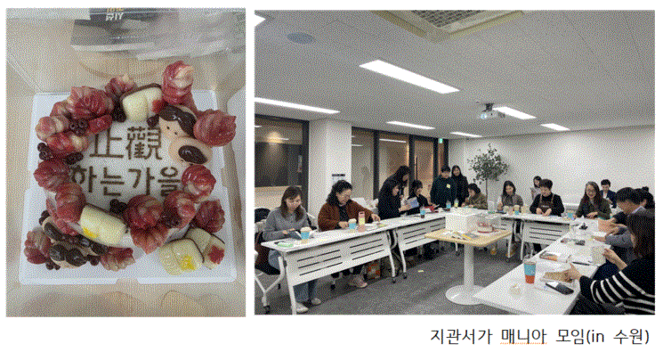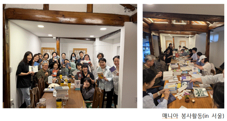 올해도 여러 지역에서 매니아 활동이 이어졌습니다. 10월 서울 봉사활동과 11월 수원 지관서가 첫 모임에 이어, 12월에는 울산에서 연말 모임을 열어 서로의 한 해를 나누는 시간을 마련합니다. 매니아를 위한 정기 자원봉사 교육도 진행 중이며, 올해 마지막 교육은 11월 29일에 열립니다. 책을 좋아하고 배움의 인연을 좋아하는 분이라면 누구든 함께할 수 있습니다. 여러분의 참여 기다립니다.